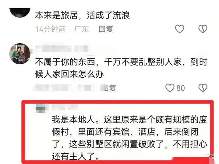 ” 可热闹背后,疑问也悄悄冒头。“房子主人会不会突然回来?”“这样住到底合法吗?” 当地村民的回应解开了部分谜团:这里曾是大规模度假村,配套宾馆酒店一应俱全,后来经营崩盘,别墅群就成了无人问津的闲置资产。有知情人补充,他所在的公司早年也在这里建过别墅,项目搁置后便不了了之,只要不惹治安问题、保持卫生,没人会特意干预。