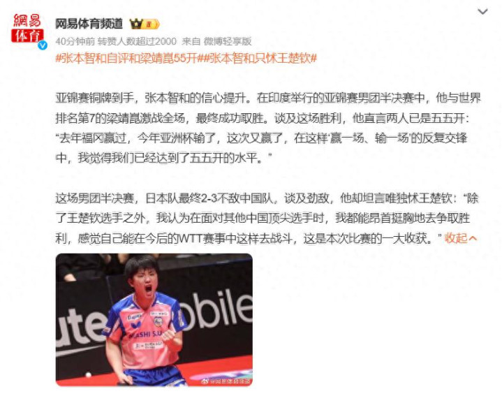 在2025年亚洲乒乓球锦标赛男团半决赛激战后,北京时间10月19日,日本乒乓球选手张本智和面对日本记者坦言:“除了王楚钦选手之外,面对其他中国顶尖选手,我都能昂首挺胸去争取胜利。”这位一向以自信著称的日本一哥,毫不掩饰他对王楚钦的特殊感受,与此同时,他却认为自己与世界排名第7的梁靖崑已达到了“五五开的水平”