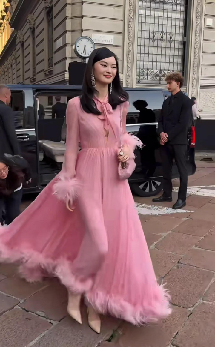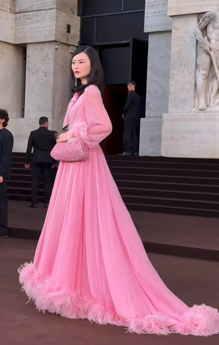 近日国际超模贺聪惊艳亮相米兰Gucci新季发布秀,只见视频中她身穿粉色羽毛裙,微风吹动她的长裙摆仙气飘飘,真是美呆了