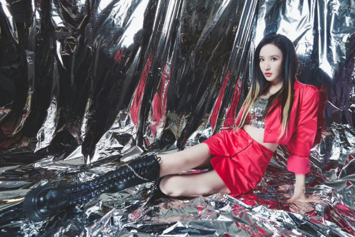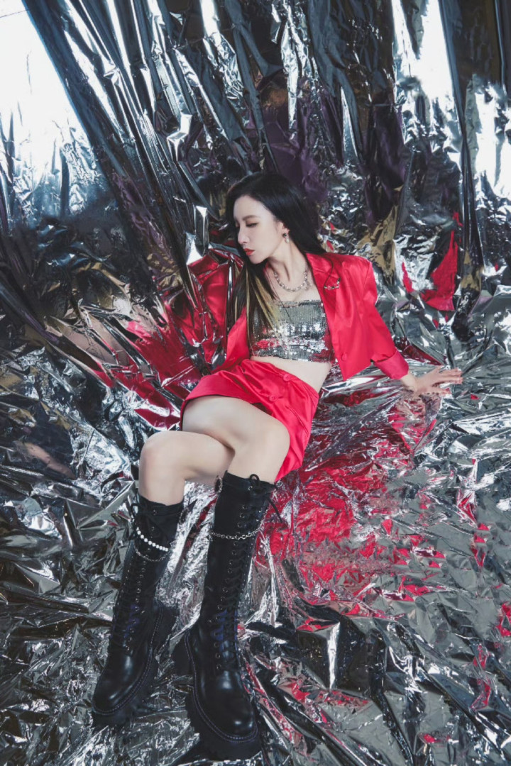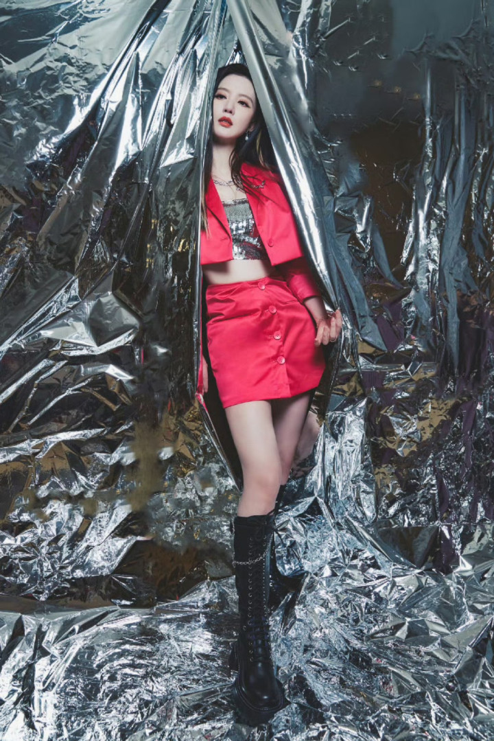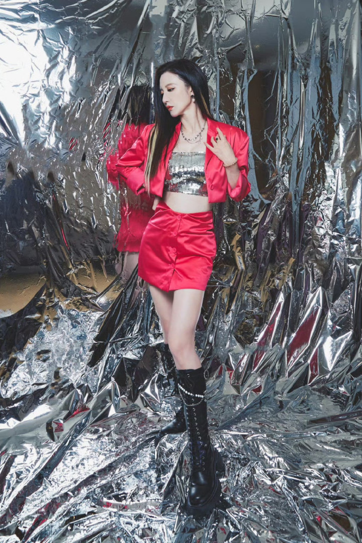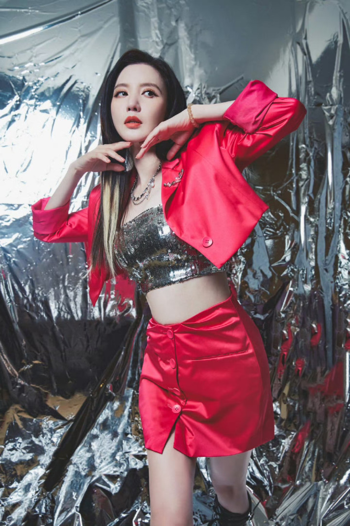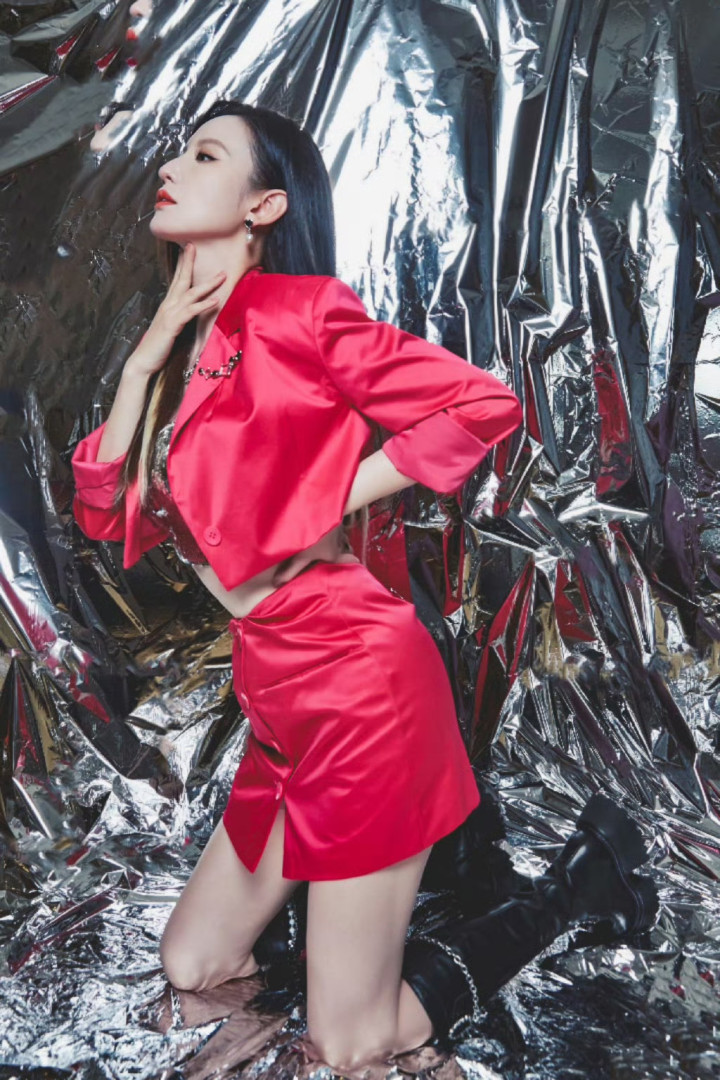 张萌, 红色超短套装, 露小蛮腰, 挑战辣妹风, 电力十足