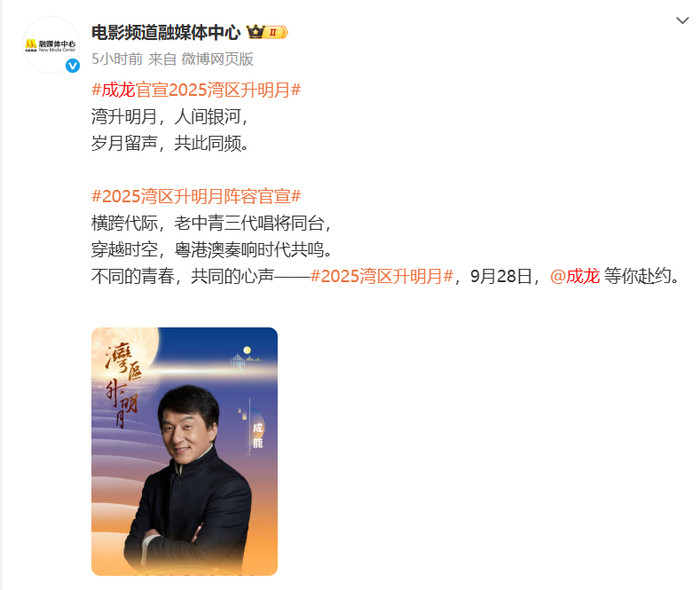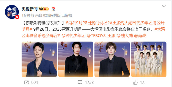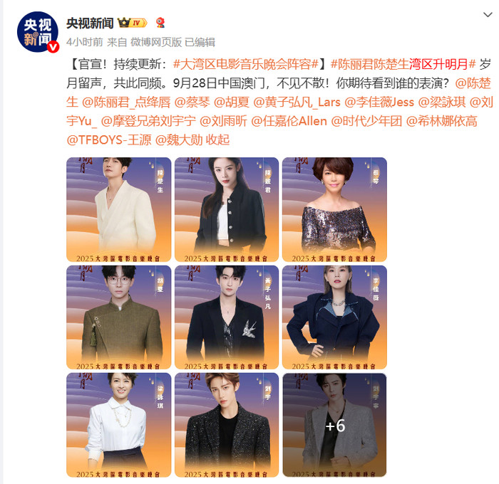 据公开资料,肖战、陈楚生、陈丽君、蔡琴、胡夏、黄子弘凡、李佳薇、梁咏琪、刘宇、刘宇宁、刘雨昕、任嘉伦、时代少年团、希林娜依高、王源、魏大勋、苏醒、欧阳娜娜等艺人将确认参加2025湾区升明月——大湾区电影音乐晚会。(排名不分先后)