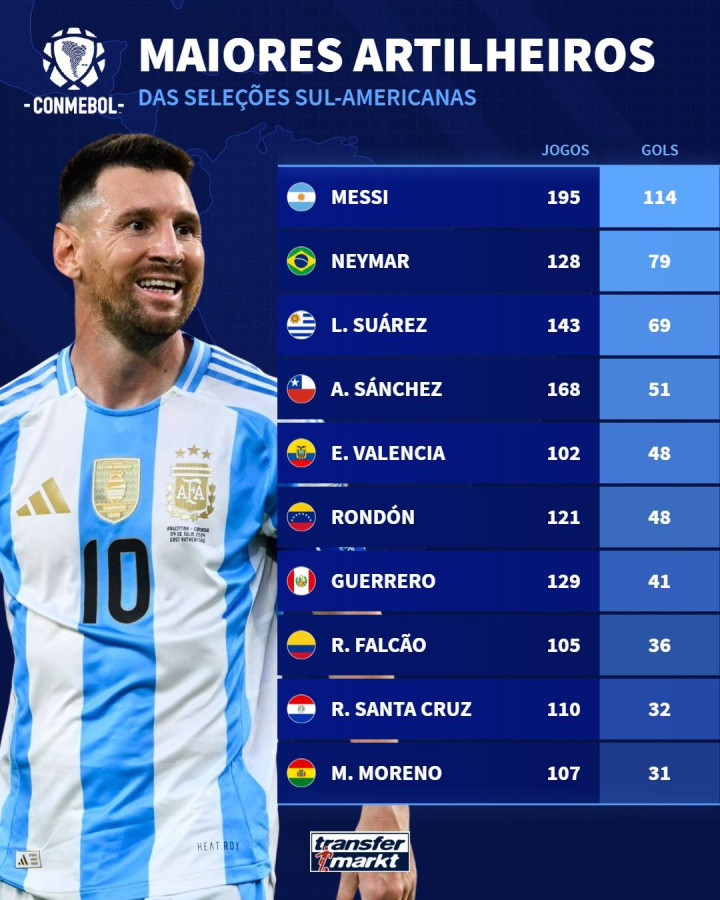 虎扑11月13日讯德国转会市场统计了南美各国历史射手王,详情如下: