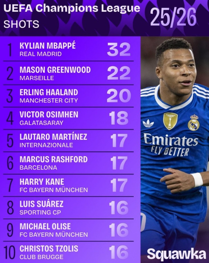 直播吧11月27日讯数据网站Squawka盘点了本赛季欧冠射门次数榜,其中姆巴佩居首,具体如下: