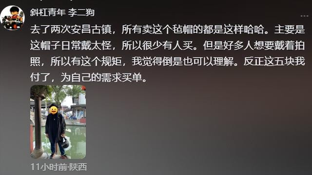 12月1日下午,记者致电浙江绍兴安昌古镇,工作人员回复说:事后他们已经关注到此事,古镇有几家商户在卖乌毡帽,由于该商户考虑到大多游客只是试戴拍照而非购买,所以制定了“试戴拍照5元”的创收模式,但这种方式未提前明确告知、也未充分尊重游客体验,事情发生后,景区工作人员找到商户,要求商户明确码标价。
