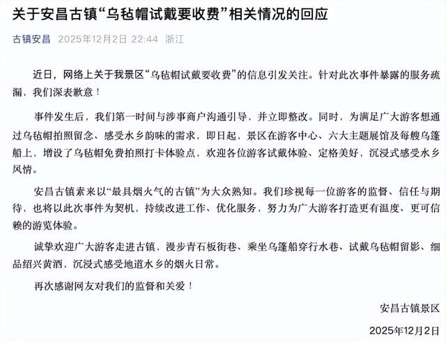 12月2日晚,安昌古镇景区就此事做出回应。景区称,针对此次事件暴露的服务疏漏,深表歉意!事件发生后,景区第一时间与涉事商户沟通引导,并立即整改。同时,为满足广大游客想通过乌毡帽拍照留念、感受水乡韵味的需求,即日起,景区在游客中心、六大主题展馆及每艘乌篷船上,增设了乌毡帽免费拍照打卡体验点,欢迎各位游客试戴体验。